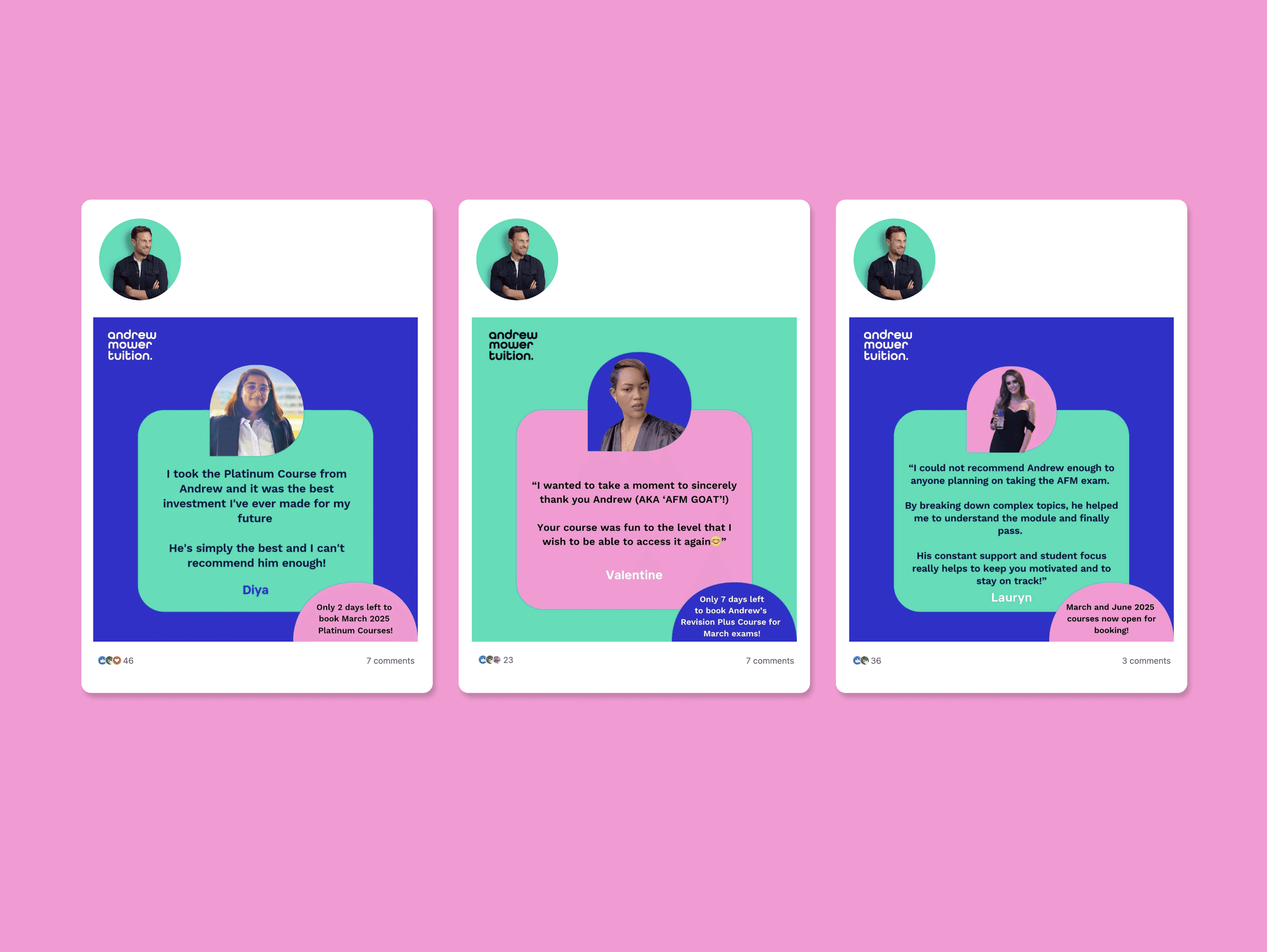 The graphics were created for the channels Andrew uses every day - YouTube, LinkedIn and Instagram. We ensured they are simple to use, consistent and designed to perform without ongoing design input.
